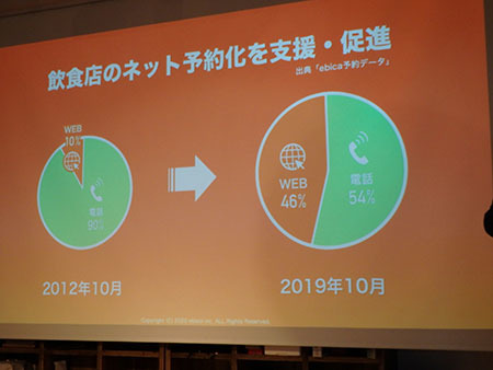 食べログやぐるなび、ホットペッパーなどのグルメサイトが普及したことで飲食店のネット予約は急増している。2012年にウェブ予約が10%、電話予約が90%だったのに対し、19年にはウェブ予約が46%、電話予約が54%とほぼ半々になっている。