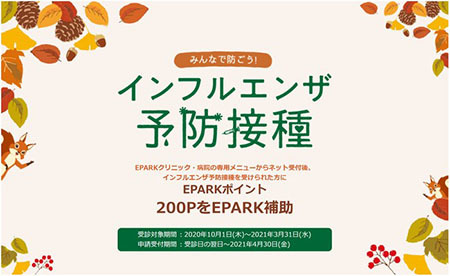 EPARKメディカルは、自社で運営する医院の検索サイト「EPARKクリニック・病院」でインフルエンザ予防接種の補助(EPARK補助)を10月1日に開始した。EPARKクリニック・病院の専用メニューからネット受付後、インフルエンザの予防接種を受けた人にEPARKポイントを200ポイント付与。受診対象期間が10月1日から2021年3月31日まで、申請受付期間が受診日の翌日から21年4月30日までとなる。