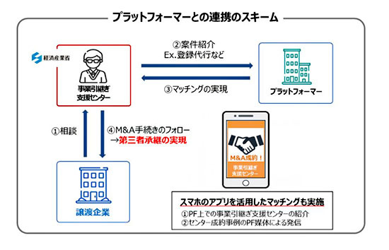 事業引継ぎ支援センターの相談者を民間プラットフォーマーに紹介して、マッチング後のフォローを双方で実施する。事業承継の機運を全国的に広めて、中小企業の経営者に抵抗感のあるM&Aを身近な形で仲介して推進する。民間M&Aプラットフォームは、スマートフォン(スマホ)のアプリを活用したマッチングも実施する。