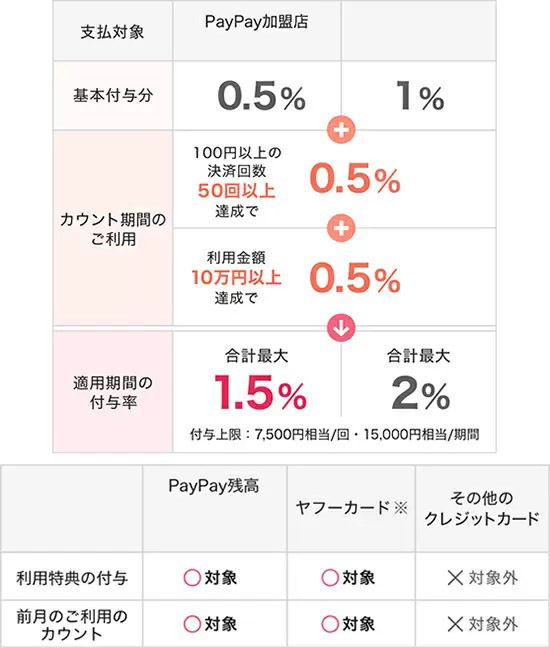 PayPayが提供するスマートフォン(スマホ)決済サービス「PayPay」は2020年4月1日から、「100円以上の決済が月間50回以上」「月間利用金額10万円以上」を満たすと、還元率がそれぞれ+0.5%アップし、PayPay加盟店・PayPay請求書払いでは、最大合計1.5%還元となる「PayPay STEP(ステップ)」を導入した。とはいえ、一時は3%還元だったので、だいぶお得感は薄れている。