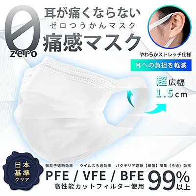 ゼロ痛感マスクは、特殊技術で耳ひもに超幅広1.5cmの柔らかいストレッチを採用することで、長時間の着用でも耳が痛くならない。不織布と高性能フィルターによって、微粒子をしっかりカットするとともに、内側に肌に優しい柔らかな不織布を使用している。