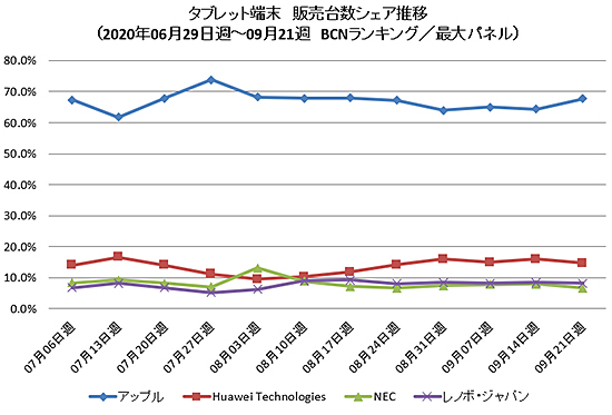 市場をけん引しているのは9月18日に発売された第8世代iPadだが、実はアップル以外のメーカーも堅調だ。特に、レノボは販売台数前年比で196.3%と2倍に迫る成長を記録している。週次の販売台数シェア推移は大きな動きがなく、アップルが7割前後で推移している。