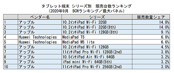 シリーズ別の販売台数シェアではさっそく第8世代iPadが2位と3位にランクイン。従来モデルも好調で上位10シリーズの内、8シリーズがアップルという結果になった。まもなく第4世代iPad Airが発売される予定で、年末商戦に向けて同社のシェアがさらに高まることが予想される。(BCN・大蔵 大輔)