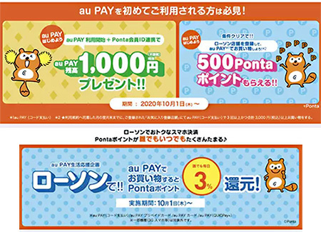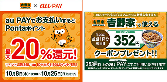 au PAYは、吉野家での導入を記念して10月8日に200円以上の支払いをすれば支払い金額20%のPonta ポイントをプレゼントするキャンペーンを開始した。還元上限は、1au IDで1500ポイント/期間。また、au スマートパスプレミアム(有料)に新規登録すれば、牛丼並盛1杯分相当(価格352円)のクーポンをプレゼントする。期間は10月25日まで。