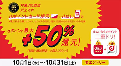 d払いは、「d払い お買物ラリー 10月はdポイントカード提示+d払いでdポイント最大+50%還元!」を実施中。対象店舗でdポイントカードまたはdポイントカードアプリを提示の上、d払いで支払うとdポイントカード・d払いの通常ポイントに加え、キャンペーン分として支払い総額に対し、1店舗で+10%、2店舗利用で+30%、3店舗利用で+50%のdポイント(用途・期間限定)で付与する。