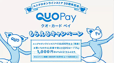 デジタルギフトの「QUOカードPay」は、ユニクロ・GUとコラボキャンペーンを開催中。ユニクロオンラインストアで税別1万円以上の買い物をすると、もれなくユニクロ店舗のみで使えるQUOカードPay1000円分がもらえる。購入完了後5日以内に送られてくるメールに、ユニクロ店舗のみで使えるQUOカードPay専用のURLを送付。URL先のQUOカードPayのコードをユニクロの店舗で提示することで利用が可能になる。