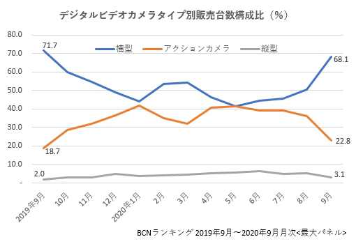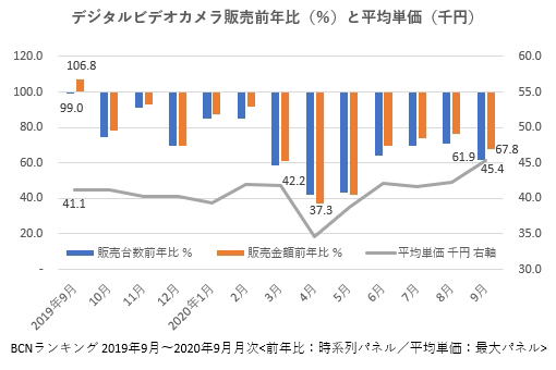 デジタルビデオカメラは9月に売れる。秋は行楽シーズン。運動会で、「わが子の勇姿を撮影したい」といった需要も高まるからだ。しかし、今年は新型コロナウイルス感染症の拡大で売り上げが大きく落ち込んでいる。さらに、昨年9月は翌10月に控えた消費税増税前の駆け込み購入が起きた月。反動で「前年比」では落ち込むことが分かっていた。BCNランキングで集計したところ、9月は販売台数前年同月比が61.9%、販売金額が67.8%。大きなマイナスではあるものの、前年比で半減しているデジカメに比べれば健闘していることが分かった。