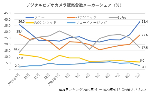 現在、主要メーカーは5社。9割以上のシェアを占める。9月の需要期にトップに立ったのはソニーだ。38.4%のシェアを占めた。同社が開発した「空間光学手ブレ補正」機能を備えた「HDR-CX680」の売り上げが群を抜いている。シェア27.6%で2位につけたのはパナソニック。90倍と高ズーム倍率ながら軽量な「HC-V480MS」が寄与した。そして、アクションカメラのGoProが17.5%で3位だった。9月はさすがにシェアを落としたが、過去12カ月で7回と最多のトップシェアを獲得したのはGoPro。2020年上半期(1~6月)でも販売台数シェア25.9%でトップを走っている。