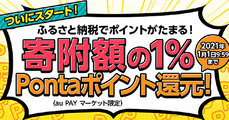 KDDIとauコマース&ライフは、ふるさと納税サービス「au PAY ふるさと納税」で本日(10月12日)から2021年1月1日までの期間中、寄附額に対して1%のPontaポイント(au PAY マーケット限定)を還元するキャンペーンを実施している。