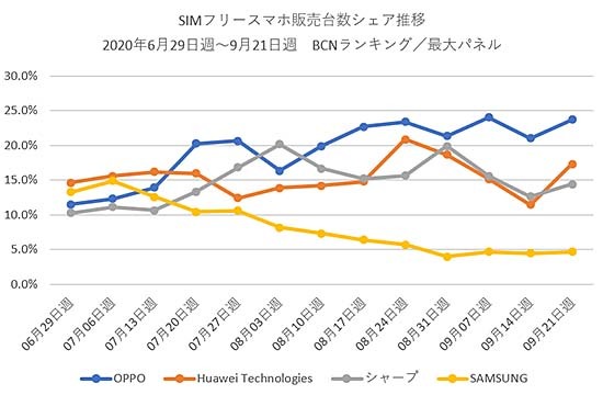直近3か月の販売台数シェア推移を週次で追うと各社の勢いの差が浮き彫りになる。6月29日週では5ポイント圏内で4社がせめぎ合っていたが、9月21日週は最大で20ポイントの開きがある。OPPOは8月10日週以降、トップを維持しており、ファーウェイとシャープがこれを追っている。