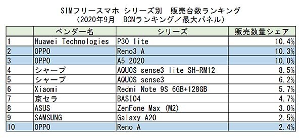 9月のシリーズ別販売台数ランキングではファーウェイ「P30 lite」がトップ。1ポイント以下の僅差でOPPOの「Reno3 A」「A5 2020」が続く。上位の常連以外ではシャオミ「Redmi Note 9S」や京セラ「BASIO4」がランクイン。新型iPhone発売以降は5Gモデルの注目も高まることが予想され、ランキングの変動が期待できそうだ。(BCN・大蔵 大輔)