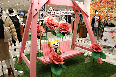 SNSとのつながりが垣間見える仕掛けは、店内のいたるところに散見される。例えば、入り口ではメルヘン調2人乗りブランコと巨大バラが出迎えてくれる。店内の靴売り場には「#あしもと倶楽部」を付けて写真を投稿するための5パターンの床面イラストと床ロゴを用意。試着室の奥にはバラのロールスクリーンが設置されている。