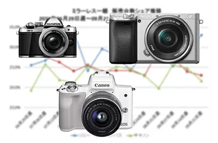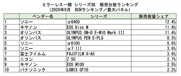 シリーズ別の販売台数シェアランキングでは、メーカーシェア上昇に貢献したソニーの主力「α6400」が首位を奪還。ここ数カ月はキヤノン「EOS Kiss M」とオリンパス「OLYMPUS OM-D E-M10 Mark III」にトップを譲っていたが、今回は僅差で制した。