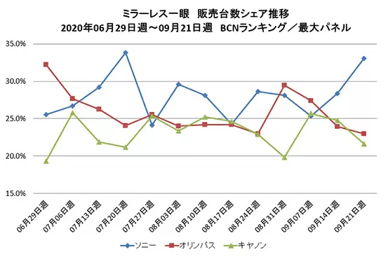 メーカー別の販売台数シェアを週次で追うと、ソニー、オリンパス、キヤノンが抜きつ抜かれつの接戦を繰り広げているのが分かる。9月に入ってからはソニーが頭一つ抜け、9月21日週では7月20日週以来の30%台のシェアを獲得。来るべき年末商戦に弾みをつけている。
