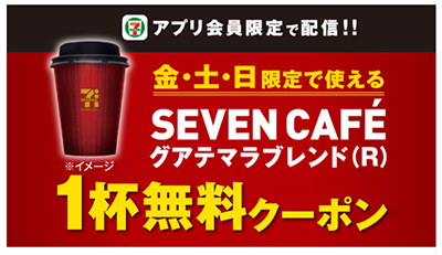 セブン‐イレブンは、アプリ会員向けに「セブンカフェ グアテマラブレンド(R)」(レギュラーサイズ)が1杯無料になるクーポンを10月16日に配信。無料クーポンは、10月16~18日限定で利用できる。10月9日から3週にわたって展開している金、土、日限定キャンペーンの第2弾となる。
