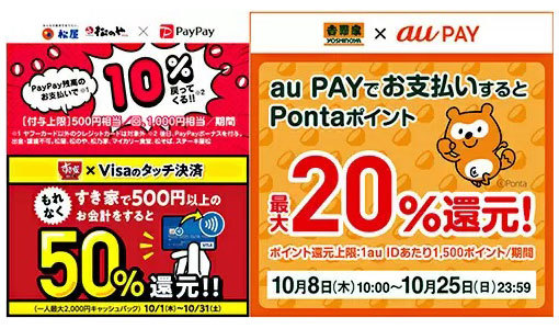 スマホ決済サービスをはじめとしたキャッシュレス決済が毎月のように開催しているお得なキャンペーン。10月も注目企画が目白押しだが、特に注目したいのが牛丼チェーンだ。