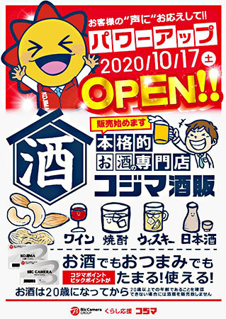 酒類もコジマのポイントサービスの対象となり、たまったコジマポイントを使って買い物をすることもできる。リニューアルオープンセール期間の10月17日から11月1日は、オープン記念特典として同社指定の酒類・飲料・おつまみのコジマポイント10%ポイントサービスを実施する。