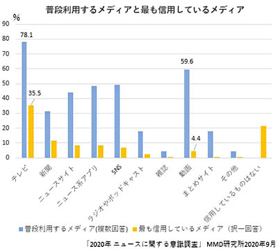 最も信用されているメディアは、まだ・やっぱり「テレビ」だった。MMD研究所が9月に実施した「2020年 ニュースに関する意識調査」によると、「最も信用できるメディア」はテレビで35.5%に上った。次いで、「新聞」が11.6%、「ニュースサイト」と「ニュース系アプリ」がそれぞれ8.2%で続いた。普段利用するメディアとして「動画」は59.6%と高かったものの、最も信用するメディアとして評価したのは4.4%にとどまった。