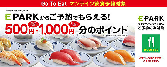 くら寿司は、「Go To Eat キャンペーン」に本日(10月19日)から参加した。くら寿司の公式アプリから遷移できるオンライン飲食予約サイト「EPARK」の専用ページで来店予約すると、次回以降の予約・来店時に、くら寿司を含めた同サイトのGo To Eat キャンペーン加盟店で利用できるEPARK専用のGo To Eatポイントを付与する。ポイント付与数は、ランチ利用で500円、ディナー利用で1000円分。くら寿司の国内全店舗で使える。