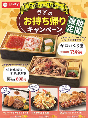 和食ファミリーレストラン「和食さと」は、テイクアウト限定の特別キャンペーンを10月19日~11月8日の21日間にわたって開催している。好評だった「かにいくら重」の特別価格798円(税別)を延長。他にも、「牛カルビのすき焼き重」や、10月からの新商品「ハンバーグとカキフライ弁当」など、全5品を期間限定キャンペーンとして特別価格で販売している。