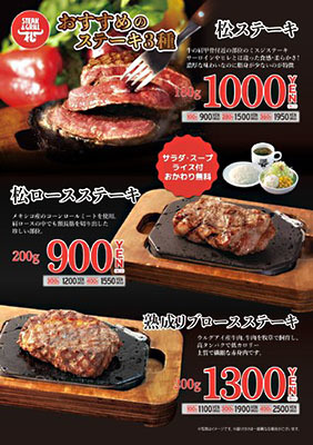 今回の目玉として、「松ロースステーキ」を900円(200g)で用意。赤身がメインでしっかりとした噛み応えのある肩ロースを使用している。また、「松ステーキ」(180gで1000円)は牛の肩甲骨付近の部位のミスジステーキで、サーロインやヒレと違った食感と柔らかさを楽しめる。さらに、ウルグアイ産の牧草で飼育された「熟成リブロースステーキ」(200gで1300円)は、高タンパクで低カロリーが特徴で、上質な繊維の赤身肉となっている。