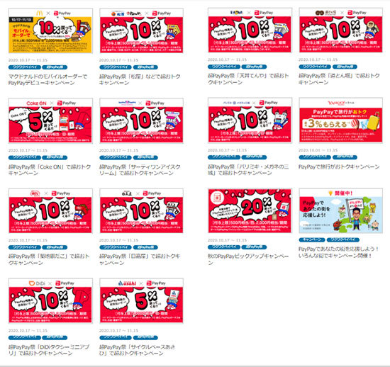 オープニングのペイペイジャンボが注目された「超PayPay祭」は、11月15日まで多くの導入企業で個別のキャンペーンを開催中。それぞれ5~20%還元キャンペーンを実施している。還元上限はそれぞれに設定されているので、合計で使える金額がかなり高い。利用する店舗が多ければ多いほど、お得になる設計だ。