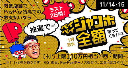 また、終盤の11月14日・15日には「超PayPay祭!フィナーレジャンボ」が開催される。決済金額の全額(100%)が抽選で戻ってくるというシステムは、オープニングジャンボと変わらない。当選確率は「3回に1回」で、1等が100%還元、2等が10%還元、3等が2%還元。