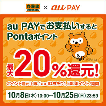 au PAYは、吉野家で10月8日から200円以上の支払いをすれば支払い金額20%のPonta ポイントをプレゼントするキャンペーンを実施中。還元上限は1au IDで1500ポイント/期間。また、au スマートパスプレミアム(有料)に新規登録すれば、牛丼並盛1杯分相当(価格352円)のクーポンをプレゼントする。期間は10月25日まで。