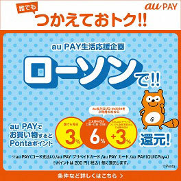 また、ローソンでは「はじめよう au PAY!1,000円(相当)分の残高プレゼント」「ローソンのお気に入り店舗で3回以上お買い物したら500Pontaポイントもらえる!」「au PAY生活応援企画」の三つのキャンペーンを行っている。特に、最後のau PAY生活応援企画は全てのユーザーが対象となるので、ローソンを頻度高く利用するなら、ぜひ押さえておきたいところだ。