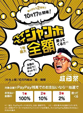 初日の10月17日には、限定キャンペーン「超PayPay祭!オープニングジャンボ」を開催。抽選で決済金額の全額分(付与上限10万円相当/回・期間)を付与するというものだった。