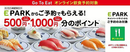 ポイント付与数は、ランチ利用で500円、ディナー利用で1000円分。くら寿司の国内全店舗で使える。くら寿司の利用後、EPARK内の専用ページに再度アクセス、レシートを登録して申請。承認されると、ポイントが付与される。