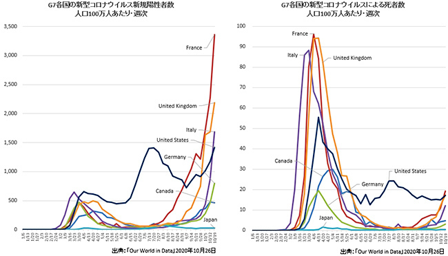 大規模な陽性者の再拡大を受け、フランスでは10月30日から少なくとも12月1日まで、全土で外出制限の実施を決定。ドイツでも11月2日から1カ月間、部分的な都市封鎖措置の実施を決めた。G7以外では、スペインが全土で緊急事態宣言を発出。春に世界各国で起きた大規模な外出制限が再び広がりそうな情勢になってきた。しかし、春と同様の厳しい規制が必要かどうかは判断が難しい。