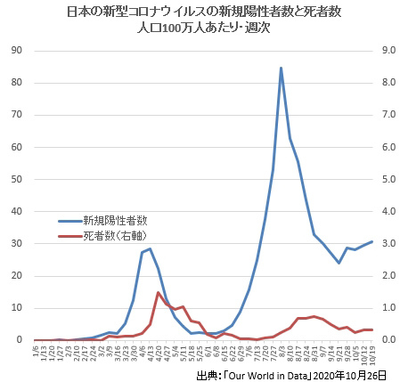 日本ではどうか。G7各国に比べると100万人当たりの陽性者数、死者数ともにはるかに少ない。他国と同じグラフにすると変化が読み取れないほどだ。そこで、日本だけを取り出し引き延ばして、足元の状況の変化を確認してみた。陽性者増については日本でも同様、第1波に比べ、8月に記録した第2波の方が陽性者が多かった。8月3日週に記録した84.6人とピークを形成。その後、9月中旬に一旦ボトムを打った後、やや増加に転じている。死者数の傾向もG7各国と同様、4月のピーク時の22.0%にとどまっている。