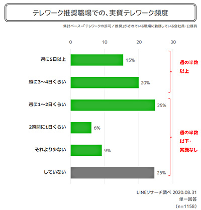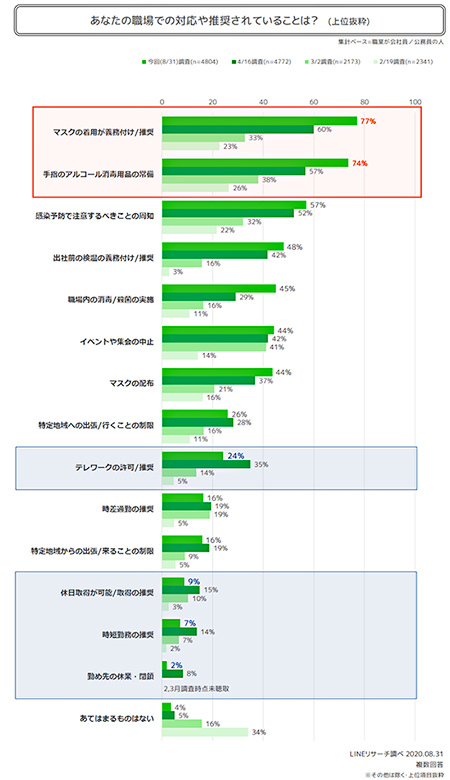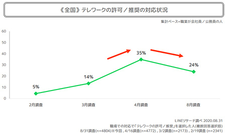 LINEリサーチは、新型コロナウイルスの感染拡大によって企業や人々の生活にどのような変化が起きているかを定期的に調査し情報発信している。第5回目の調査(8月31日実施)の中から、テレワークの実施状況を、過去調査からの推移を踏まえて結果を発表した。それによると「テレワークの許可/推奨」を行っている職場は、全国で24%となった。最も高かった前回調査(4月)時点の35%からは11ポイント減少している。4月の緊急事態宣言では、緊急避難的に急激に拡大したテレワークだったが、そこから4か月経過し、新しい生活様式(ニューノーマル)にも慣れて再度調整がかかっていることが考えられる。
