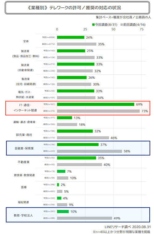 業種ごとにみると、4月から8月の間で、とくにテレワーク対応の減少が顕著だったのは「教育・学校法人」(前回49%/今回10%)「金融・保険業」(前回58%/今回37%)だった。一方、「IT・通信・インターネット関連」(前回73%/今回69%)の業種はやや減少したものの引き続き高い水準で、約7割の職場で対応が継続している。