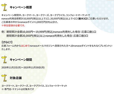 参加登録(エントリー)の上、キャンペーン期間中に、対象店舗(ヨークマート、ヨークフーズ、ヨークプライス、コンフォートマーケット)でnanacoを利用した累計金額1万円を1口として、最大3口まで応募でき、山分け対象口数に応じ、1nanacoポイントから最大2000nanacoポイントもらえる。