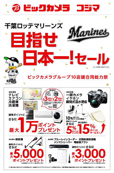 ビックカメラは、千葉ロッテマリーンズのクライマックスシリーズ進出を祝し、「千葉ロッテマリーンズ 目指せ、日本一!セール」を11月9~15日まで開催する。
