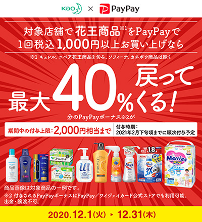 対象店舗で1000円(税込み)以上の花王商品をスマートフォン(スマホ)決済サービス「PayPay」で購入した全てのユーザーに、買上金額の最大40%をPayPayボーナスで付与する「花王商品の購入で最大40%戻ってくる」キャンペーンが再び始まる。期間は12月1日から12月31日まで。