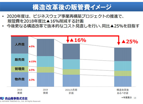 人員のスリム化で抜本的なコスト構造改革を実行することで、販管費は18年度比で今年度16%減、将来的には25%の削減を目指す。