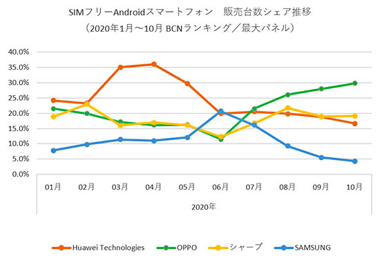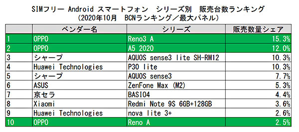 全国の家電量販店やECショップのPOSデータを集計する「BCNランキング」によると、SIMフリーAndroidスマホ市場でOPPOが2020年7月~10月の4カ月連続で販売台数シェアNo.1を獲得した。