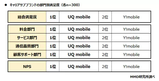キャリアサブブランドの満足度はUQ mobileが全ての分野で1位を獲得