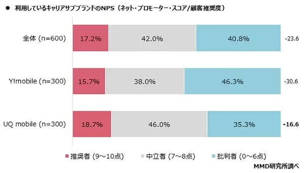 利用しているキャリアサブブランドを、家族や友人にすすめたいかどうかを10点満点で採点してもらい、NPS(ネット・プロモーター・スコア/顧客推奨度)を算出したところ、9~10点をつけた推奨者が17.2%、7~8点をつけた中立者が42.0%、0~6点を付けた批判者が40.8%となり、推奨者から批判者を引いたNPSはマイナス23.6となっている。サービス別のNPSは、UQ mobileがマイナス16.6、Y!mobileがマイナス30.6だった。