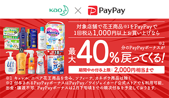 また、12月に見逃せないのが、決済金額の最大40%をPayPayボーナスで付与する「花王商品の購入で最大40%戻ってくる」キャンペーンだ。高還元率で話題になったキャンペーンが帰ってきた。対象店舗は、ウエルシア、ツルハドラッグ、マツモトキヨシなど。1回の支払いにおける付与上限、開催期間中の付与合計上限ともに2000円相当。期間は12月31日まで。