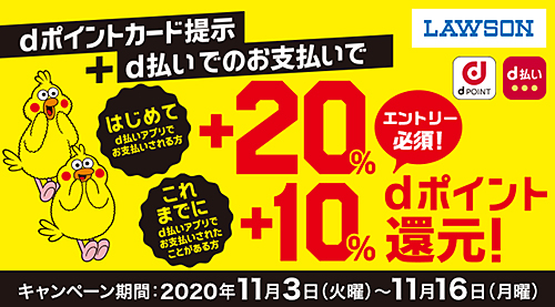 d払いは、11月3日から「ローソン・ローソンストア100 限定!d払い最大+20%還元キャンペーン」も実施中。ローソン・ナチュラルローソン・ローソンストア100でdポイントカード・モバイルdポイントカードを提示して、d払い決済すると10%相当分のdポイントを還元する。こちらも、初めての利用するユーザーに還元率が20%に上がる仕様になっている。期間は11月16日まで。