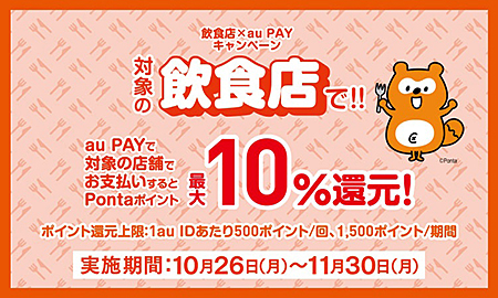 au PAYは、au PAYで支払うと最大10%のPontaポイントを還元する「飲食店×au PAYキャンペーン」を開催中。期間中のポイント還元上限は、1au ID当たり500ポイント/回、1500ポイント/期間。対象店舗は居酒屋から牛丼チェーン、ファミレスまで幅広い。ユーザーは、公式サイトで確認しておくといいだろう。