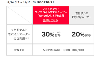 ラストスパートの11月14日と15日の2日間は、マクドナルドや松屋、松のや、Coke ONで、1カ月間にわたって開催していた超PayPay祭のポイント還元率がさらにパワーアップ。例えば、マクドナルドのモバイルオーダーがソフトバンク・ワイモバイルスマホユーザー、Yahoo!プレミアム会員だと30%、それ以外のPayPayユーザーだと20%のポイント還元といった具合だ。
