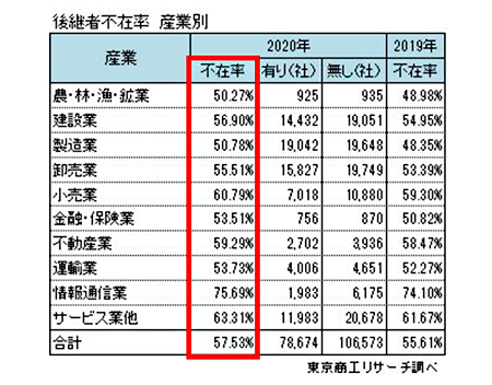 「後継者不在」の企業の産業別は、19年は農・林・漁・鉱業が48.9%、製造業が48.3%で、二つの産業が50.0%を下回ったが、今年は10産業すべてで50.0%を上回った。
