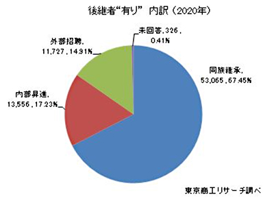 後継者「有り」の7万8674社では、息子、娘などへの「同族継承」を予定する企業は5万3065社(構成比67.4%)で約7割を占めた。次いで、従業員へ承継する「内部昇進」が1万3556社(同17.2%)、社外の人材に承継する「外部招聘」が1万1727社(同14.9%)で、いずれも20%を割り込んだ。