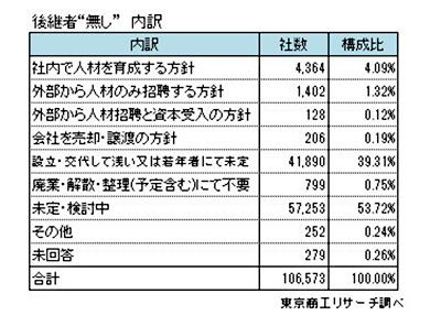 一方で、「会社を売却・譲渡の方針」は206社(同0.1%)、「外部からの人材招聘と資本受入の方針」は128社(同0.1%)にとどまり、第三者への承継へのニーズが依然として低いことがうかがえる。