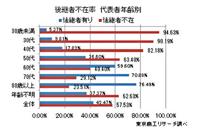 東京商工リサーチはこのほど、企業の「後継者不在率」に関する2020年の調査結果を発表。中小企業の後継者問題が深刻になる中、「後継者不在率」は57.5%で、前年より1.9ポイント上昇した。代表者の年齢別の後継者不在率は、60代が40.4%、70代が29.1%、80歳以上が23.5%だった。前年比では60代が0.5ポイント、70代が0.2ポイント、80歳以上が0.3ポイント、それぞれ改善した。しかし、依然として代表者が高齢でも、後継者不在の企業が多い実態が浮き彫りになった。